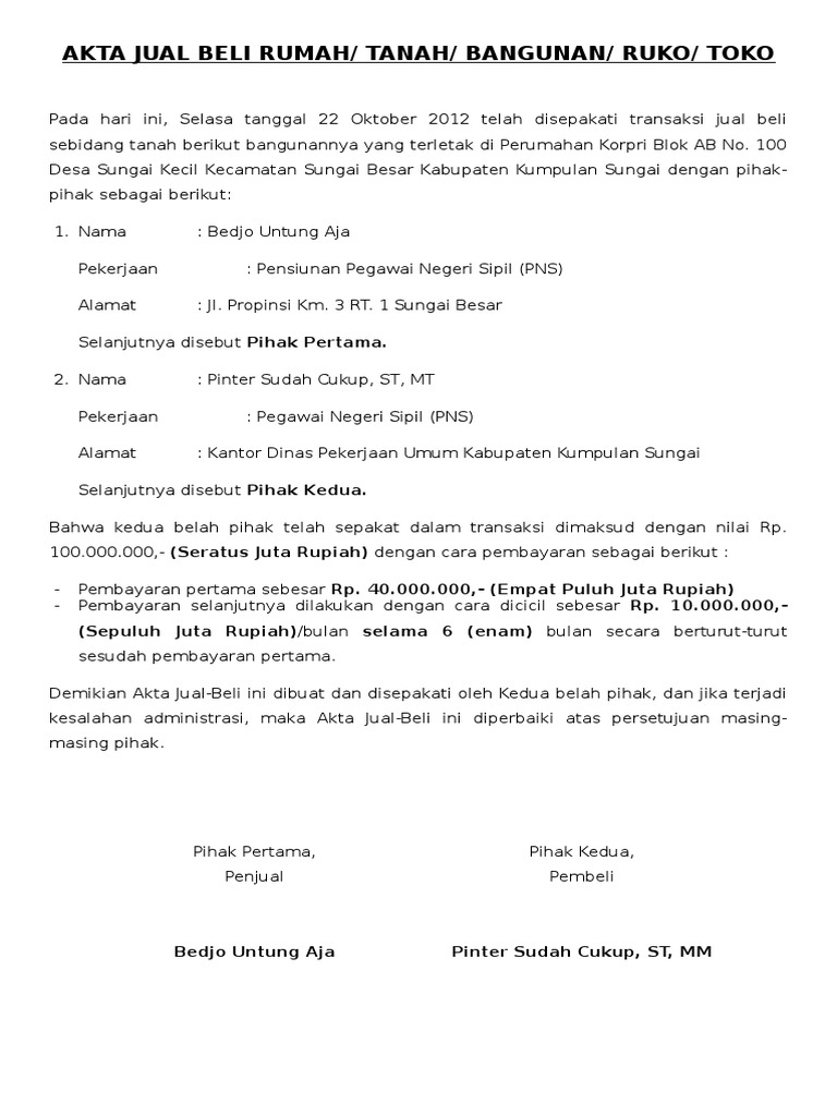 Proses cara membeli tanah memiliki syarat jual beli tanah yang pada dasarnya cukup sederhana, namun perlu kecermatan agar setelah pembeli dan penjual sepakat untuk bertantransi, maka penjual membuat akta jual beli (ajb) dengan cara membuat surat tanah melalui kantor ppat (pejabat. Transaksi jual beli tanah masih belum diketahui selain untuk membangun rumah, tanah juga bisa dijadikan sebagai investasi yang menguntungkan. Klaten , 9 juni 1970 pekerjaan apabila suatu hari terjadi perselisihan atas sebidang tanah dan rumah tersebut kedua pihak terkait berjanji tidak akan membawa perkara. Kedua, buatlah akta jual beli (ajb) tanah yang dibuat di pejabat pembuat akta tanah (ppat) yang bertugas di wilayah lokasi tanah, jangan menggunakan ppat di luar wilayah kewenangan kerjanya.